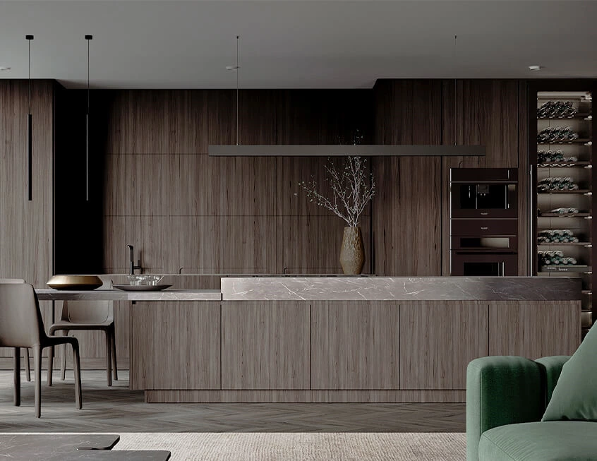Dark tone rules this kitchen. It gives a very cohesive look with continuous wood finish and sintered stone countertop, creating a steady and harmonious atmosphere.