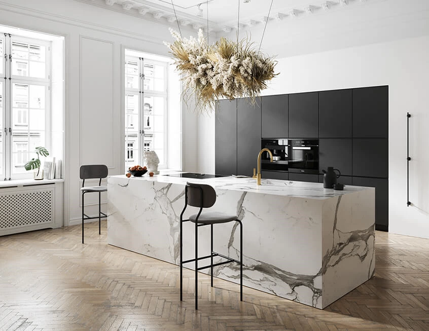 It comes to be one of the most popular kitchens because of its clean and minimalist aesthetics. It has a simple look but opt for contrasting finishes to keep the space from falling boring. An embedded black cabinetry draws the eye, and the central island combining cooking and eating is versatile.