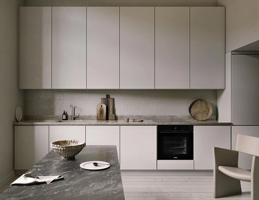 The entire kitchen radiates coherence and comfort, echoing a contemporary style. Sleek, streamlined surface expresses minimalistic taste. A sintered stone dining table is enough to draw the eye and enrich the space.