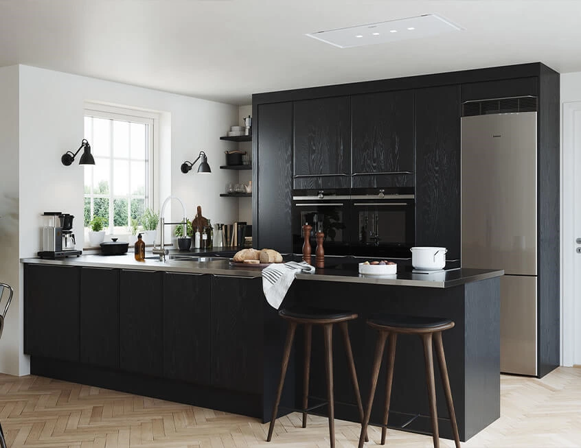 The black texture and silver accents are perfectly matched to create a high contrast with the white wall, making the kitchen the most attractive place of this house.