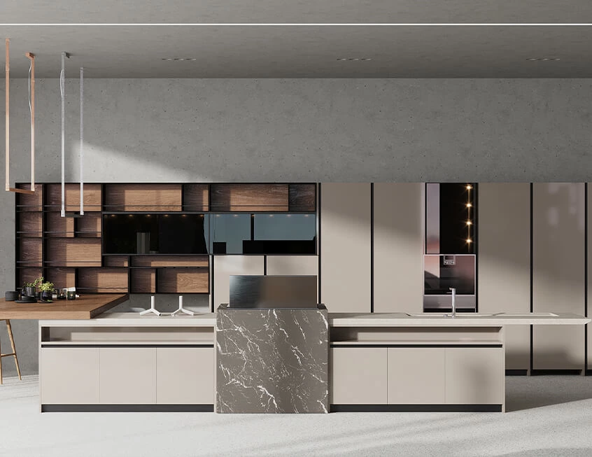 Create a glamorous kitchen space with large modern cabinetry. Open and closed storage tall cabinet units take a subtle balance here. The whole features linear details from waistline, kicker and cabinet frame. Mixed countertop adds visual aesthetics and functionality. You can have meal preparation and cooking on the stone countertop and assign the wooden countertop as the eating area.