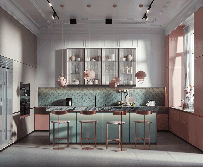 This colorful kitchen cabinet is extremely ideal for the customer who loves sweet and tender style. Guest seating at the island creates a"kitchen as stage" feeling. Changhong glass as the door panels of the wall cabinet along with the lighting inside creates a hazy atmosphere, making it look more fashionable and bright. Quarts stone countertop is scratch and heat resistant, of which unique grain making beautiful ink effect. Corresponding with the backsplash design and the waistline made of sintered stone, it also adds some vividness to the kitchen.