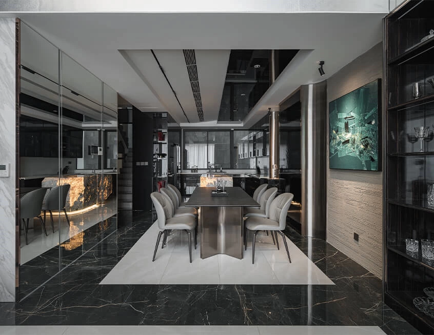 This kitchen diner is designed with ultra-modernism. The marble island makes a powerful statement with geometric shape and internal lighting. Gloss finishes and reflective materials, like mirror and glass doors balance off the rich dark tones and add a shiny touch to the space.