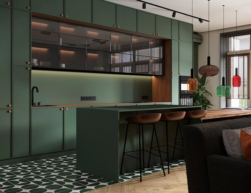 Challenge stereotypes of kitchen, and sets the saturated green as the keynote. Pair with brass handles, dark brown high stools and warm wooden countertops to create a retro, modern kitchen and dinning space through exquisite integration.