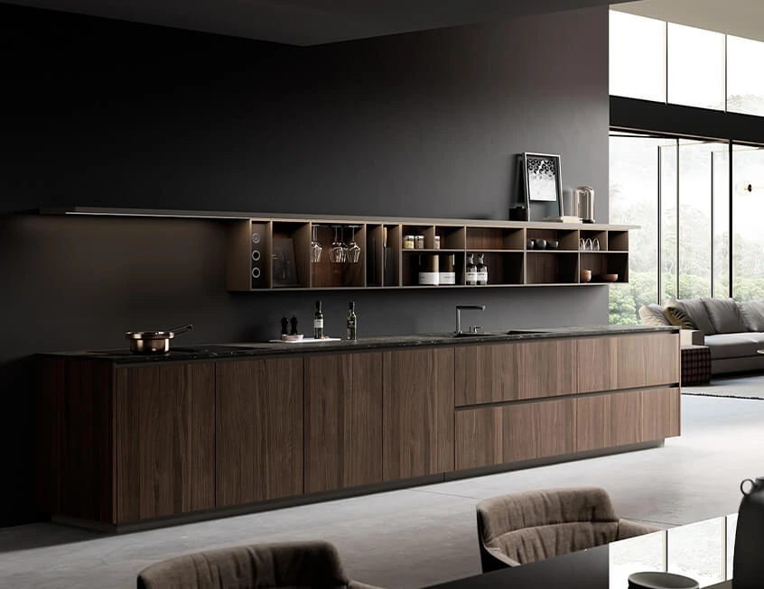 Walnut wood pairs with glass and matte lacquer finishes, this kitchen is a perfect fusion of nature and modern beauty. Integrated kitchen and meal design enhances the openness of the home space.
