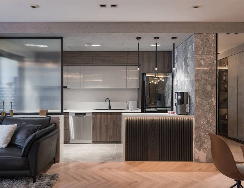 The walnut kitchen cabinets lay the foundation for the kitchen space, showcasing a natural texture. Paired with glossy white wall cabinets, they combine vintage and modern qualities, creating a serene and elegant aesthetic. The multifunctional peninsula serves as an additional countertop for cooking preparations and also doubles as a bar area for social interactions. With frosted glass cabinet doors as partitions, the space is divided while maintaining an open and connected atmosphere.