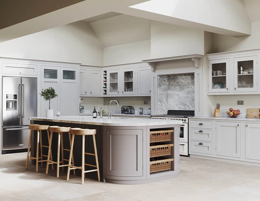 Equal parts of elegant and laidback feel, the large creamy cabinetry is beautifully detailed in Shaker style and topped by sintered stone countertops. There's plenty of storage space, and glass fronted cupboard doors allow kitchenware to be displayed and also for ease of their location. Wine racks and storage baskets on either side of the island, and the chance to impress with built-in appliances.