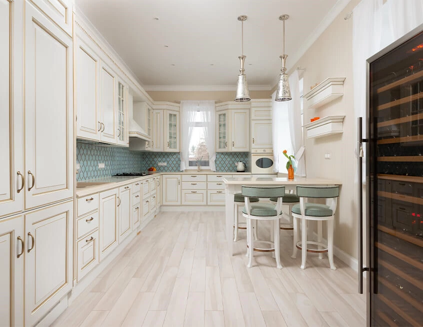 This design results in a stunning, large, classic kitchen diner, with white shaker-style cabinetry and countertops that create an inviting space. Beautiful molding gold lines on the door and the light fixtures, and the aqua backsplash add an element of elegance and freshness.
