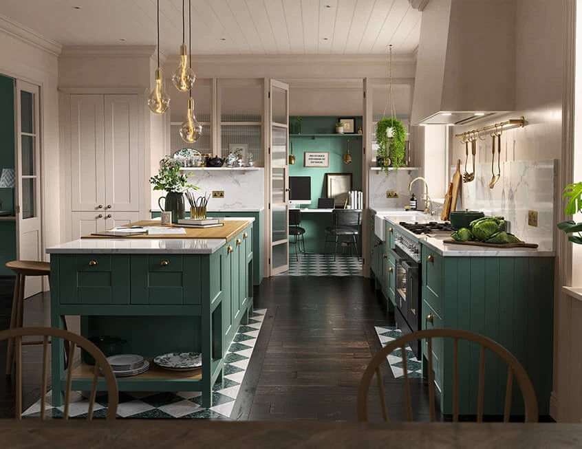 The green and off-white combo makes you want to slow down, be present, and connect with nature. Dark wood flooring and furniture tap into this essence. Gold accents is enough to add some timeless feel.