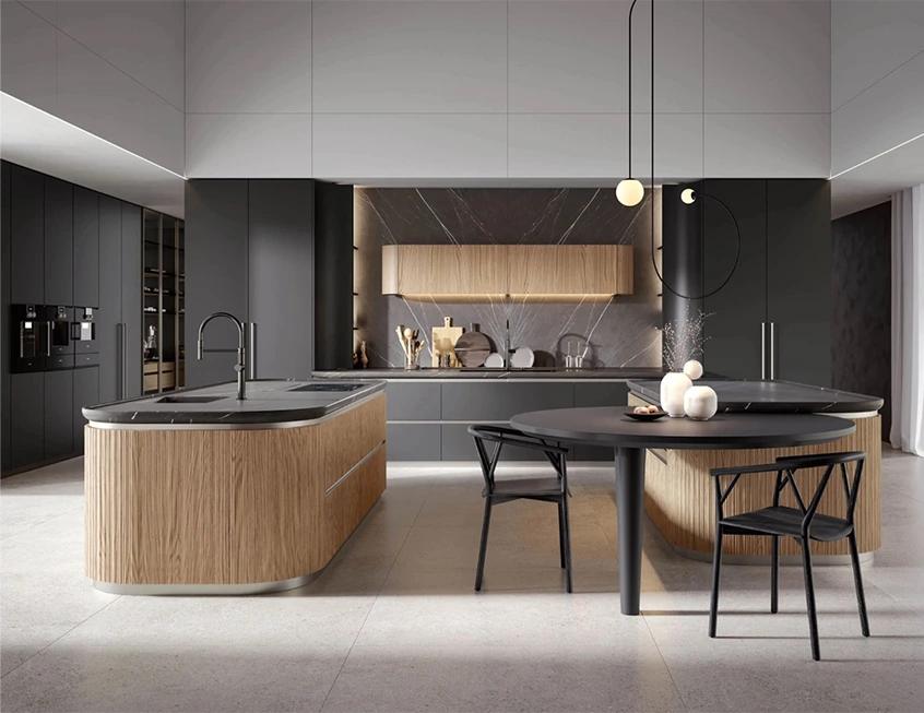 This kitchen is designed for both enjoyable cooking and social connection. A pair of islands anchor the space — one dedicated to prep and cooking, the other featuring a rounded dining extension that doubles as extra storage and a perfect spot for buffet-style entertaining. Full-height cabinets frame the scene with mixed finishes and backlit storage, bringing together the smooth surfaces and textures in a way that feels both modern and natural.