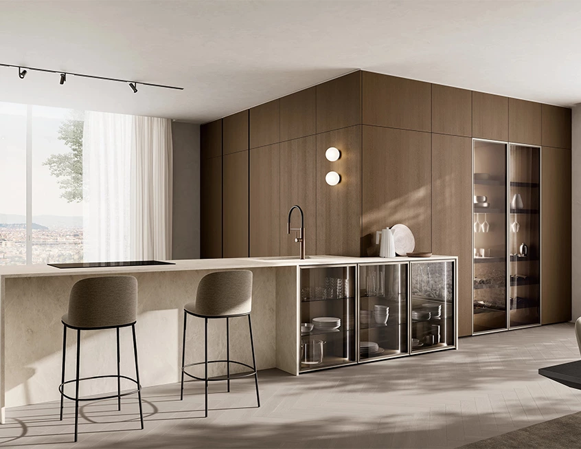 The whole facade underscores a minimalist sophistication with integrated handle pulls, a walk-in pantry and glass-fronted storage. The island topped by sintered stone counters extends into a casual bar zone that invites conversation and everyday dining. Thoughtful detailing — from integrated open shelving to precision lighting above work surfaces — ensures that the kitchen is always ready for entertaining and efficient for daily routines.