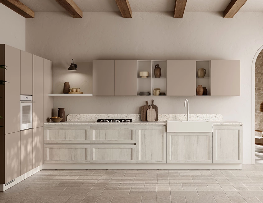 Subtle depth comes from ivory and soft terracotta cabinets and the warm beige quart countertop, which also ties back to the rustic bones, effortlessly balancing lightness and coziness.