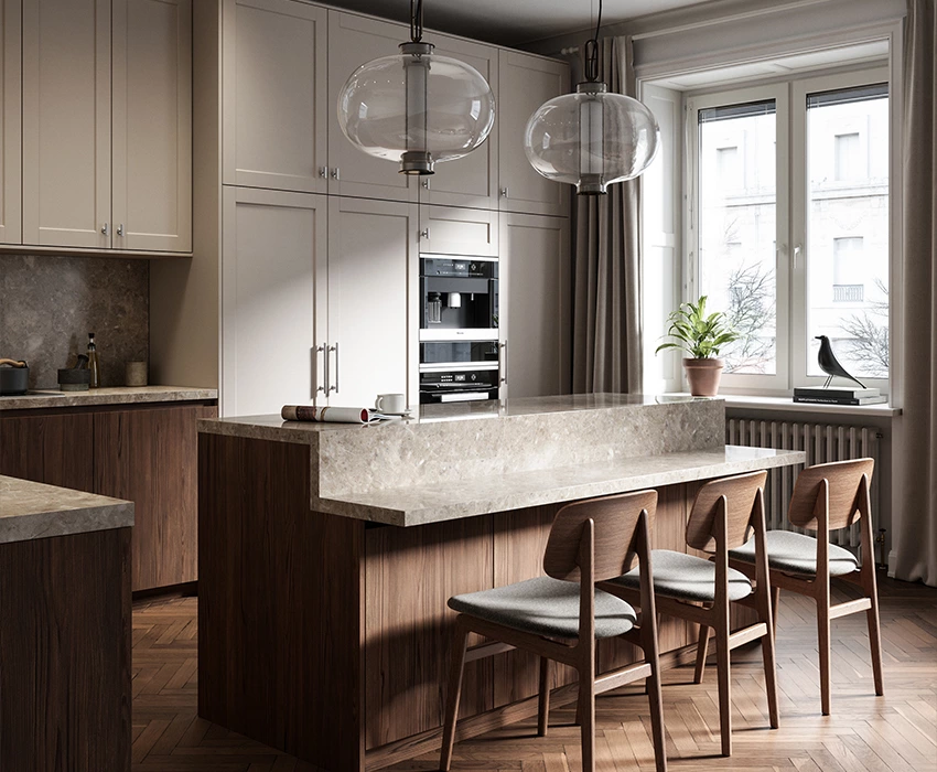 In such a Navian style kitchen with elegance and tenderness to the core, step-designed island may first catch your eye. With the unique light pendants, it helps well entertain your guests in a laidback atmosphere. The combination of retro shaker door and warm white color,together with wood texture, is classic and cozy. Waistline and kicker design accentuates the base cabinet and makes it easy to open.