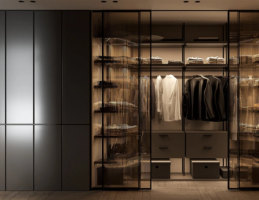This walk-in closet consists of a selection of drawers, adjustable shelving with sensor recessed lighting as well as double hanging. Patterned glass sliding doors allow for partial visibility and add a shiny touch.