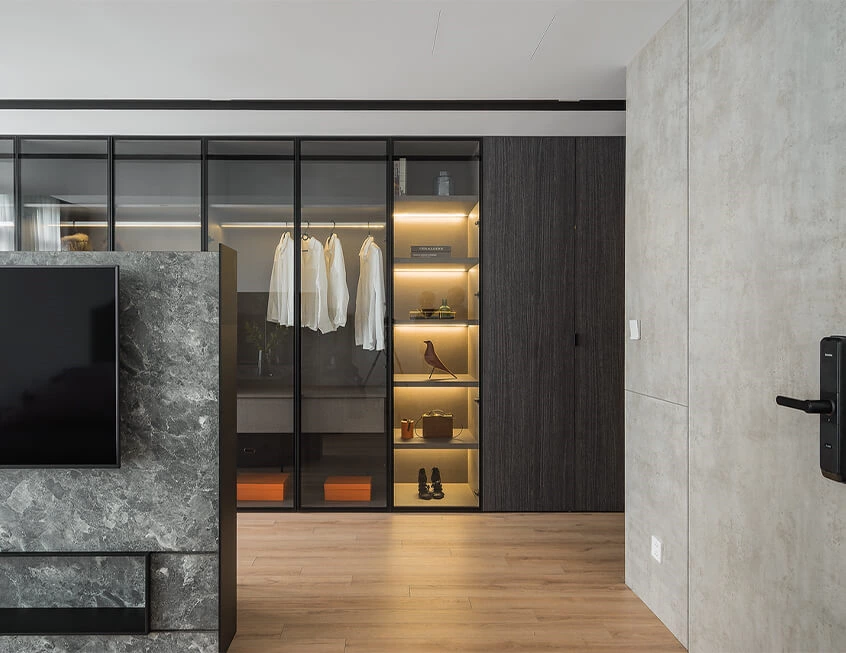 The continuous wardrobe unit creates an elongated sense of depth in the space, maintaining an open and flowing atmosphere in the narrow layout. The minimalist lines add a three-dimensional and modern touch, exuding a subtle sense of sophistication. The fusion of glass wardrobe and solid wood storage cabinets ensures orderly organization, allowing clothes to be visible and easily accessible. The low partition on one side serves as a dressing table, providing convenience for daily preparation.