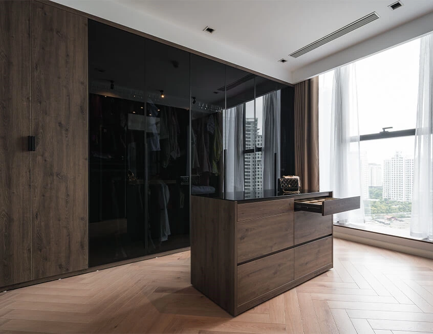 Crafted against the wall, the floor-to-ceiling cabinet facade boasts powerful storage capabilities. The perfect blend of the warmth of natural wood and the modern touch of glass creates a harmonious dual decorative effect. Integrate the wardrobe with the dressing table and introduce a central island counter to enrich both the visual appeal and spatial functionality.