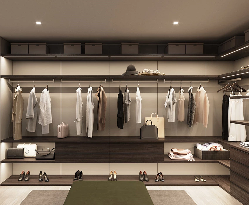Craft a neutral yet unique modern walk-in closet for an especially fashionable client. The floating shelves and hardware-free drawers provide ample storage while also appearing clean and fresh. Incorporate high-quality hanging rods and under-mount lighting for display or easy grabbing of frequently worn clothing.