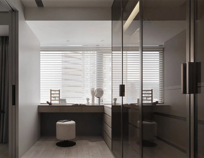 The design of the dressing table by the window allows for natural light to fill the space, providing a comfortable and pleasant grooming experience. The combination of glass doors and the absence of a main light fixture allows for more flexible access to clothing while presenting a modern style with a sense of luxury. Slide the pocket door completely into the wall or slide it out, to meet your needs for flexible bedroom space layout.