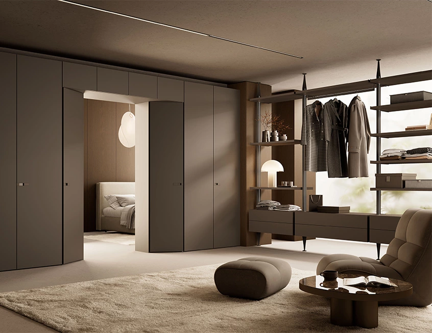 Think of this walk-in as a quiet invitation to start your day with ease. Here, bi-fold doors sit flush within the full-height wardrobe unit, offering flexible space partition that allows both a streamlined wall and a generous, full-access opening. A pair of open shelves and hanging space, and closed storage units balances daily convenience and practicality. Metallic and leather accents of the open frame and handles add contrasts of texture and a subtle sense of polish.