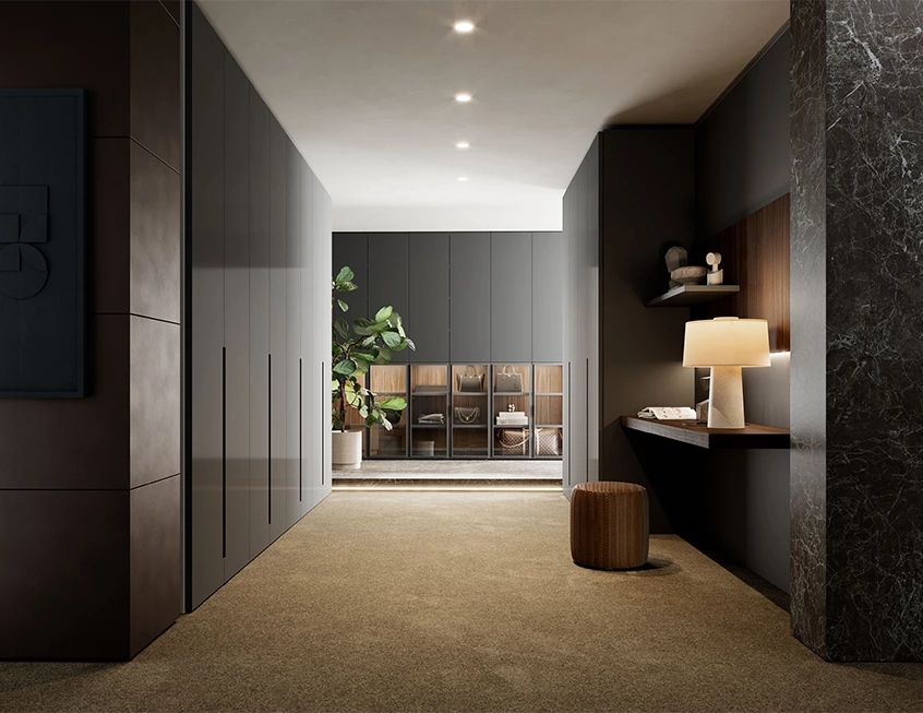 A grey color palette is punctuated with moments of saturated wood tone and reflective glass in this open walk-in closet. The combination feels quietly modern, with just enough contrast to keep the space visually engaging.
